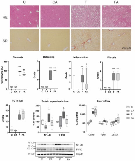 Atorvastatin treatment reduced steatosis and inflammation in mice with NASH. Representative hematoxylin and eosin (HE) and Sirius red (SR) staining (magnification ×100). NASH was induced in mice by 24 weeks of F diet consumption, with atorvastatin (A) administered orally (20 mg/kg/day) during the last three weeks. Corresponding control groups received a chow (C) diet. The steatosis was scored according to the percentage of parenchymal involvement. The lobular inflammation, ballooning, and the fibrosis were graded according to the NASH Clinical Research Network scoring system [29]. Abbreviations: ND—not detected. Data are presented as median values, with boxes and whiskers representing the interquartile range and fifth to 95th percentiles, respectively. * p < 0.01, ** p < 0.01, and *** p < 0.001 atorvastatin and/or F-diet vs. vehicle/chow diet–treated mice; † p < 0.05 and †† p < 0.01 atorvastatin-treated vs. vehicle-treated NASH mice.
