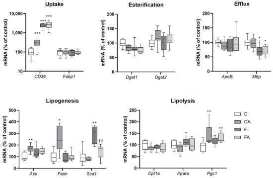 Atorvastatin and NASH modulated the expression levels of lipid metabolism genes in the liver. NASH was induced in mice by 24 weeks of F diet consumption, with atorvastatin (A) administered orally (20 mg/kg/day) during the last three weeks. Corresponding control groups received a chow (C) diet. Data are presented as median values, with boxes and whiskers representing the interquartile range and fifth to 95th percentiles, respectively. * p < 0.01, ** p < 0.01, and *** p < 0.001 atorvastatin and/or F-diet vs. vehicle-administered chow diet–treated mice; †† p < 0.01 atorvastatin-treated vs. vehicle-treated NASH mice.