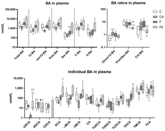 F diet consumption and atorvastatin modulated BA concentrations in plasma. NASH was induced in mice by 24 weeks of F diet consumption, with atorvastatin (A) administered orally (20 mg/kg/day) during the last three weeks. Corresponding control groups received a chow (C) diet. Data are presented as median values, with boxes and whiskers representing the interquartile range and fifth to 95th percentiles, respectively. * p < 0.01, ** p < 0.01, and *** p < 0.001 atorvastatin and/or F-diet vs. vehicle-administered chow diet-treated mice; † p < 0.05 and †† p < 0.01 atorvastatin-treated vs. vehicle-treated NASH mice. BA are presented as follows: 12α-hydroxylated (12 BA), non12α-hydroxylated (non12 BA), primary (Prim-BA), secondary (Sec-BA), conjugated (C-BA), unconjugated (U-BA), ursodeoxycholic acid (UDCA), hyodeoxycholic acid (HDCA), chenodeoxycholic acid (CDCA), deoxycholic acid (DCA), α/β muricholic acid (α/β MCA), and cholic acid (CA), with taurine conjugates TUDCA, THDCA, TDCA, TMCA, and TCA.