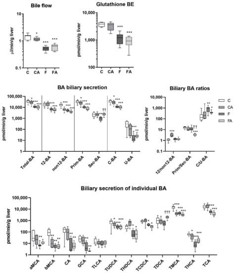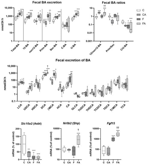 The impact of statins on BA homeostasis has been studied in healthy animals. Under these circumstances, statins reduced the liver and intestinal contents of several BA [20,21] and increased fecal BA excretion [20,22,23]. Together with simultaneous changes in messenger RNA (mRNA) expression of enzymes and transporters mediating BA turnover, their results indicate that statins have the potential to alter BA homeostasis in liver pathologies such as NASH. However, comprehensive data concerning the effects of statins on BA turnover during NASH are missing. Similarly, no study has explored the influence of statins on the biliary secretions of individual BA in healthy animals. It is of interest to mention that, despite the significant posttranscriptional modulation of crucial transporters for enterohepatic recycling of BA during NASH, available studies have demonstrated the expression of relevant molecules mainly at the mRNA level [24,25,26]. Therefore, the present study characterized concentrations of individual BA in plasma, bile, and feces of mice with NASH induced by 24 weeks of consumption of a high–saturated fat, high-fructose, and high-cholesterol diet (F), with atorvastatin administered during the last three weeks. Significant differences were found in BA metabolism in the atorvastatin-treated group.