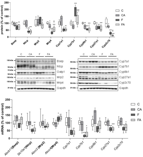 Influence of atorvastatin treatment and F diet consumption on the mRNA and protein expression levels of BA-related genes in the liver. NASH was induced in mice by 24 weeks of an F diet, with atorvastatin (A) administered orally (20 mg/kg/day) during the last three weeks. Corresponding control groups received a chow (C) diet. Data are presented as median values, with boxes and whiskers representing the interquartile range and fifth to 95th percentiles, respectively. * p < 0.01, ** p < 0.01, and *** p < 0.001 atorvastatin and/or F-diet vs. vehicle-administered chow diet–treated mice; † p < 0.05 and †† p < 0.01 atorvastatin-treated vs. vehicle-treated NASH mice.