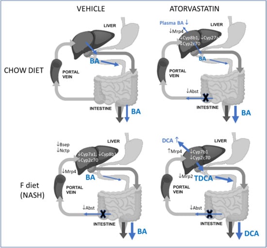 Possible mechanisms responsible for the effects of atorvastatin on BA metabolomics in mice with dietary-induced NASH. Changes induced by NASH and atorvastatin are depicted with arrows. The thickness of the blue arrow refers to the nature of change (increase or decrease) in the function vs. the corresponding untreated group. Abbreviations: BA—bile acids, Bsep—bile salt export pump; CD36—platelet glycoprotein 4, fatty acid translocase; DCA—deoxycholic acid; Mrp2/4—multidrug resistance–associated protein 2/4; Ntcp—Na+-taurocholate co-transporting polypeptide.