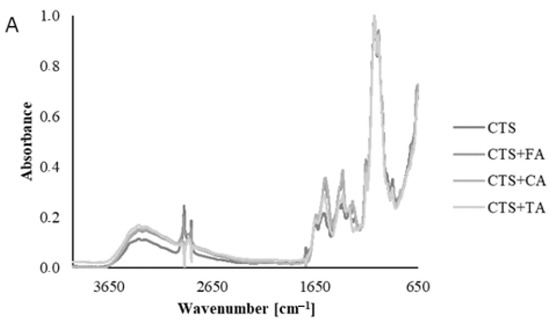 The spectra obtained for the chitosan-based films modified by phenolic acids are of a similar shape (Figure 1). All the characteristic peaks for chitosan are observed. A strong band in the 3329 cm−1 region corresponds to N-H and O-H stretching. The bands at around 2921 and 2851 cm−1 can be attributed to symmetric and asymmetric stretching of C-H, respectively. All these bands are characteristic of polysaccharides. A peak at 1641 cm−1 is observed on each spectrum, which confirms the presence of residual N-acetyl groups (C=O stretching of amide I) and 1321 cm−1 (C-N stretching of amide III). Furthermore, the peak corresponds to N-H bending of amide II to the one observed at 1531 cm−1. The CH2 bending and CH3 symmetrical deformations presence corresponds to the band at 1373 and 1314 cm−1. The band at 1062 cm−1 corresponds to the C-O stretching [20]. All the peaks are present in the spectra of the pure chitosan films as well as those modified by phenolic acids with no difference. It suggests that only hydrogen bonds are formed between chitosan and phenolic acid and they do not cause structural changes. When compared, the spectra of each film before and after irradiation present no significant changes resulting from exposure to UVC light. It allows making an assumption that the proposed sterilization method by UVC is safe and does not bring about chitosan/phenolic acid structural changes.