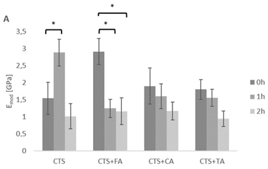 Mechanical properties are important when considering thin films use as packaging materials. Mechanical parameters as Young Modulus, maximum tensile strength and elongation at break were determined (Figure 4) with the use of the universal testing machine. First of all, it may be noticed that the phenolic acids addition affected the Young Modulus. The highest Emod value was observed for the material composed of chitosan and ferulic acid. Secondly, the irradiation by UVC slightly modified the Young Modulus of CTS and CTS+FA (after 1 h) as well as CTS+FA and CTS+TA (after 2 h). For chitosan, it increased twice after 1 h as a result of the photocross-linking process. However, in the case of films modified by phenolic acids, a decrease in Young Modulus is clearly seen. However, different correlations may be noticed for chitosan. Where the irradiation of pure chitosan for 1 and 2 h results in the improvement of σmax, the elongation at break of films obtained from CTS+TA is higher, but for CTS+FA and CTS+CA dl is lower; however, the UVC radiation does not cause any significant changes.