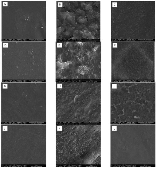 Comparison of bacterial adhesion to the films surface after 14 days of incubation in a bacterial suspension for Figure 2. h: CTS (A–C), CTS+FA (D–F), CTS+CA (G–I), CTS+TA (J–L) as control (A,D,G,J), Staphylococcus aureus (B,E,H,K), Escherichia coli (C,F,I,L) (SEM 5000×; the presented pictures are representative for 3 experiments).