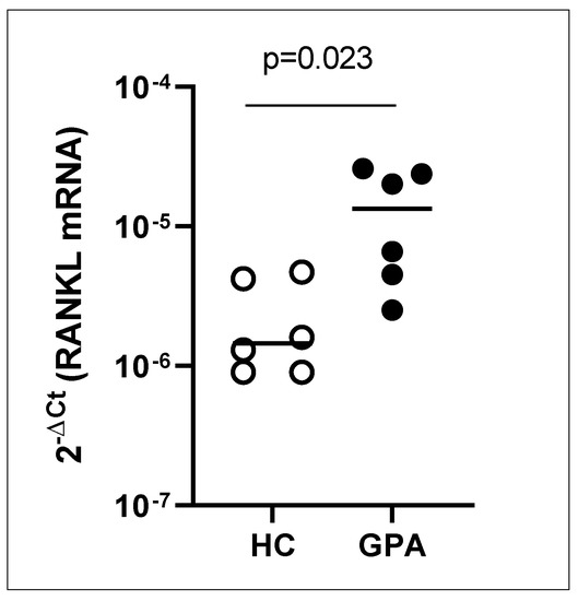 Elevated RANKL mRNA (NM_003701.4) expression by PBMC derived from patients with GPA compared to healthy controls (HC, n = 6 each). The 18S rRNA gene (NR_003286.3) was used for normalization. Primer sequences are available upon request.