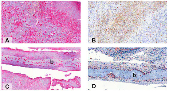 S100A4+ cells (red, (A)) and CD68+ cells (brown, (B)) in nasal tissue of GPA (serial staining), presumably palisading histiocytes, marking the edge of a granuloma. S100A4+ cells (red, (C)) and Vimentin+ cells (reddish brown, (D)) invading bone (b) in nasal tissue of GPA (serial staining), presumably fibroblasts. Immunohistochemistry for S100A4 in nasal tissue of GPA (n = 3) was performed as described previously [164]. The upper respiratory tract tissue samples of GPA were characterized in previous studies [22,76].