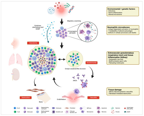 Development and function of the granulomatous inflammation in GPA. A combination of predisposing genetic factors as well as exogenous and endogenous immune-stimulatory patterns such as infections, altered microbiome, and sterile inflammation serve as initial trigger for the recruitment and activation of extravascular primed neutrophils forming neutrophil-rich microabscesses. Appearance of multinucleated giant cells (MGC) in close proximity represents a primary granulomatous feature of this early stage of the granulomatous lesion. Immunogenic cell death (dysregulated apoptosis, necrosis, necroptosis, NETosis) leads to the release of damage-associated molecular patterns (DAMP) and contributes to increased availability of the (altered) autoantigen proteinase 3 (PR3). Concomitant pro-inflammatory cytokines and chemokines drive recruitment of further immune cells, converting the neutrophil-rich necrotizing lesion to a monocyte/macrophage-rich granuloma. Palisading histiocytes around a necrotic zone, accompanied by MGC and the accumulation of monocytes, as well as lymphocytes, define the characteristic histological feature seen in the respiratory tract and the kidney. Occurrence of inflammation-related ectopic lymphoid structures (ELS) set the prerequisite for the loss of tolerance against the autoantigen PR3 that is continuously displayed by high numbers of neutrophils and monocytes within the granulomatous lesion. Tissue damage occurs as result of ANCA-induced systemic vasculitis and inflammation- and fibroblast-mediated local destruction of cartilaginous and osseous tissues in the upper respiratory tract. Created with BioRender.com (accessed on 10 April 2021).