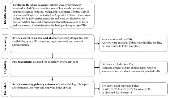 This systematic literature review was conducted and reported in line with criteria stipulated by the PRISMA recommendations [63,64]. Literature monitoring was performed regularly until 25 April 2021. Our eligibility criteria included clinical, in vivo and in vitro preclinical studies involving FcRn and nasal delivery of any type of biologic. Eligible articles were original research articles irrespective of their publication date. Clinical studies that were considered for eligibility were randomized or nonrandomized controlled clinical trials, comparative studies and observational studies. Animal and in vitro preclinical studies had to be relevant to human health. Systematic reviews, narrative reviews and single-patient case reports were excluded.