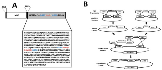 Design and construction of the HER2(scFv)-PE24B immunotoxin fusion protein. (A) Schematic representation of MBP-HER2(scFv)-PE24B. (B) The MBP-HER2(scFv)-PE24B plasmid was constructed by the multisite Gateway cloning method.