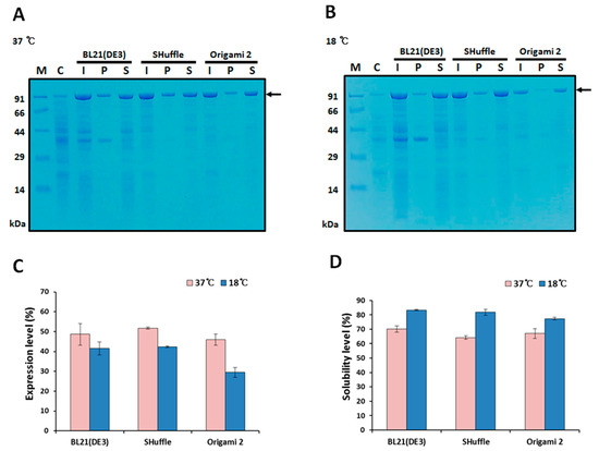 Expression and solubility of MBP-HER2(scFv)-PE24B in different E. coli hosts. Expression of the MBP fusion protein was induced by 0.5 mM IPTG at 37 °C (A) and 18 °C (B). The arrows indicate MBP-HER2(scFv)-PE24B (97.4 kDa). M, molecular weight size markers; C, total proteins of BL21(DE3) before IPTG induction (negative control); I, total proteins after IPTG induction; P, insoluble pellet fraction after cell sonication; S, soluble fraction after cell sonication. (C) Expression levels and (D) solubility levels at 37 °C and 18 °C for the three E. coli hosts. The expression and solubility levels were analyzed using the densitometry method and three replicate experiments. The expression levels (%) of MBP-HER2(scFv)-PE24B were calculated based on the density ratio of MBP-HER2(scFv)-PE24B to total E. coli proteins. Solubility levels (%) were calculated based on the density ratio of solubly expressed MBP-HER2(scFv)-PE24B to the total expressed MBP-HER2(scFv)-PE24B.