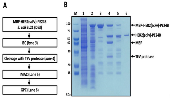 Purification of HER2(scFv)-PE24B in BL21(DE3). (A) Flow chart of the purification steps. IEC, ion exchange chromatograph; TEV, tobacco etch virus; IMAC, immobilized metal affinity chromatography; GPC, gel permeation chromatography. (B) MBP fusion-derived HER2(scFv)-PE24B purified from BL21(DE3) M, molecular weight size markers; lane 1, total cell proteins before IPTG induction (negative control); lane 2, soluble proteins after cell sonication from total cell proteins induced by IPTG; lane 3, MBP-HER2(scFv)-PE24B fusion protein (97.4 kDa) purified by cation exchange chromatography; lane 4, MBP tag cleavage with TEV protease (28.6 kDa) showing the MBP tag (43.9 kDa) and HER2(scFv)-PE24B (53.5 kDa); lane 5, IMAC purification of HER2(scFv)-PE24B after TEV cleavage; lane 6, HER2(scFv)-PE24B (53.5 kDa) purified by gel filtration chromatography.