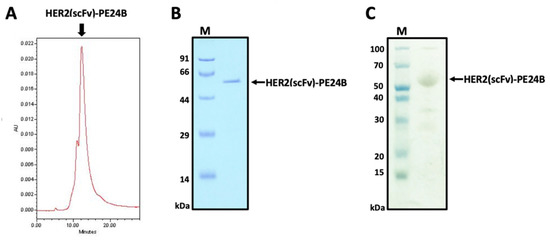 To determine the HER2(scFv)-PE24B purity, the final product was analyzed by HPLC using a Protein-pak 300SW SEC 7.5 × 300 mm column. The column was equilibrated with at least 10 CVs of 1 × PBS buffer, pH 7.4, using a Waters 600 Controller connected to a Waters 486 Tunable Absorbance Detector and a Waters 717 Plus Autosampler from Waters Corporation (Milford, MA, USA). The protein was injected onto the column at a flow rate of 1 mL/min over 25 min. The protein elution peaks were detected at 280 nm and checked by SDS-PAGE. The HER2(scFv)-PE24B purity was also evaluated using a Silver Stain Plus kit. The reaction was completed by adding 5% acetic acid (v/v) for 15 min when the bands became visible.