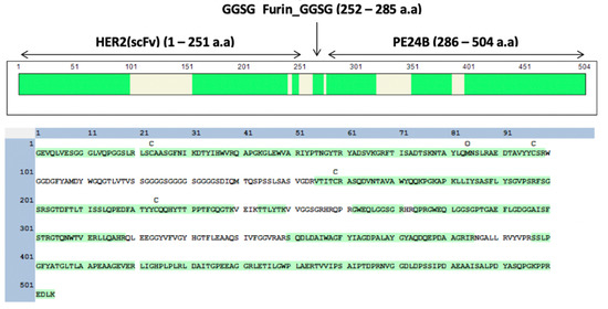 - Lee, S.; Park, S.; Nguyen, M.T.; Lee, E.; Kim, J.; Baek, S.; Kim, C.J.; Jang, Y.J.; Choe, H. A chemical conjugate between HER2-targeting antibody fragment and Pseudomonas exotoxin A fragment demonstrates cytotoxic effects on HER2-expressing breast cancer cells. BMB Rep. 2019, 52, 496–501. [Google Scholar] [CrossRef] [PubMed]