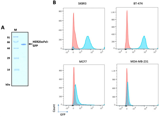 HER2 levels on the surface of four breast cancer cell lines. (A) Purified HER2(scFv)-GFP (54.4 kDa) from E. coli was used for FACS analysis. (B) SKBR3, BT-474, MDA-MB-231, and MCF7 cells were incubated with HER2(scFv)-GFP and stained with DAPI. Red represents cells not treated with HER2(scFv)-GFP and blue indicates cells treated with HER2(scFv)-GFP.