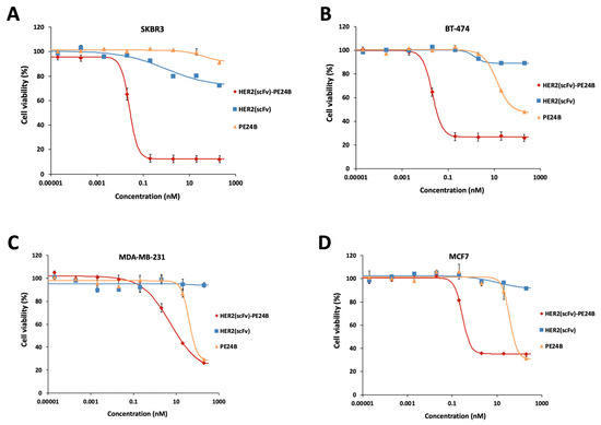 The cell viability was determined with an MTT assay. Briefly, 5 × 104 cells were seeded in a 24-well plate and incubated at 37 °C for 18 h. Thereafter, HER2(scFv)-PE24B, HER2(scFv), and PE24B were used to treat high HER2-expressing cell lines SKBR3 and BT-474 and low HER2-expressing cell lines MDA-MB-231 and MCF7. After 72 h, the cell viability was determined. All protein concentrations were tested in triplicate.