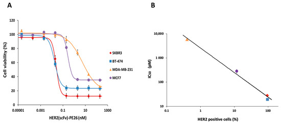 Correlation of the cytotoxicity of HER2(scFv)-PE24B and the HER2-positive percentage of cell lines. (A) The cytotoxicity of HER2(scFv)-PE24B against each of the four cell lines plotted together. Data are presented as mean ± standard error (SE). (B) IC50 values for HER2(scFv)-PE24B and HER2 expression show a strong negative correlation. As the percentage of HER2-positive cells increases, the IC50 of HER2(scFv)-PE24B decreases. The data were fitted using the power function: IC50 = 2561.2 × (percentage of HER2-positive cells)−1.023 with an R2 value of 0.9917. The key shows the symbols corresponding to MDA-MB-231, MCF7, SKBR3, and BT-474.
