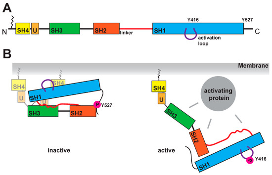 Schematic of SFK domains and activation mechanism. (A) SFKs are organized in several domains: the SH4 domain (in yellow), a unique domain (in light orange), the SH3 domain (in green), the SH2 domain (in dark orange), the SH1 domain (in blue). At the N-terminal end, SFKs contain a lipid anchor, which is localizing the kinase at the membrane. The linker region between the SH2 and SH1 domain is crucial for the activation mechanism. A further structural feature is the activation loop within the SH1 domain, which contains a tyrosine residue (for Src Y416) that is phosphorylated in the active state of the kinase. (B) Comparison of inactive and active states of SFK. In the inactive conformation, the tyrosine in the activation loop is not phosphorylated, while the tyrosine (Y527 for Src) at the C-terminus carries a phosphate residue as it binds to the SH2 domain. The closed conformation is stabilized by the linker region binding to the SH1 and SH3 domains simultaneously. SH4 and unique domain seem to be more flexible, and recent studies found binding of the SH4 domain to the SH1 domain [32] (two possible conformations are shown). The open conformation is induced by the binding of an activating protein, which can interact with the SH3, SH2, SH1 domains and the linker. This active conformation shows phosphorylation of the tyrosine (for Src Y416) in the activation loop and dephosphorylation of the tyrosine in the C-terminus (for Src 527).