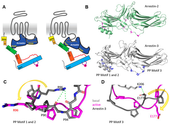 Arrestins have two major functions in GPCR regulation. First, receptor desensitization and internalization through recruitment of clathrin-coated pits [64,65] and second, the recruitment and activation of effectors such as MAPK and SFKs ([63] and reviewed in [66,67]). However, the concept of purely arrestin-based signaling has been recently challenged [68]. The active state of arrestins can be induced through their binding to the phosphorylated C-terminus (‘tail’ conformation) or the hydrophobic intracellular pocket between the helices of a GPCR (‘core’ conformation) [69,70] (Figure 2A). Activation by other regulatory molecules such as IP6 or a C-tail phosphopeptide has also been described [71,72,73]. The ‘core’ conformation is essential for the desensitization of G-protein signaling, while arrestin in the ‘tail’ conformation loses its desensitization ability [74]. Nevertheless, in the ‘tail’ conformation, arrestin internalization and signaling are still possible. The most dominant conformational change during the activation of arrestin is the rotation of the N- and C-domains towards each other. With this domain rotation, multiple small conformational changes appear (also called switch regions for arrestin-3) [75]. It is predicted that at least one of the previously described switch regions in arrestin-3 could be unique for this protein. This regulatory element contains a polyproline motif, which is a classical binding motif for SH3 domains. The interaction of SFK SH3 domains with polyproline motifs in arrestin are substantial for the activation of SFKs [76].