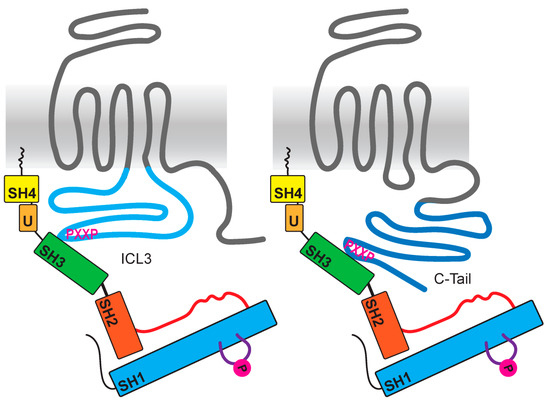 Next to the typical interaction with polyproline motifs, another or an additional possibility is the interaction with phosphorylated tyrosine residues through the SH2 domain of SFKs. This could be shown for β2AR through mutation of residue Y350 in the C-terminal tail, which resulted in the decrease of Src phosphorylation and also impaired the desensitization of the receptor [99].