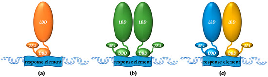 NRs can bind as (a) monomers (e.g., certain orphan receptors), (b) homodimers (e.g., steroid hormone receptors), or (c) heterodimers (often with RXR) to DNA response elements. LBD = ligand binding domain, DBD = DNA binding domain, AF-1 = activation function 1.