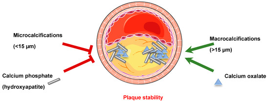 Vascular calcification affects plaque stability. Microcalcifications (0.5–15 µm) and spotty calcifications are positively associated with plaque rupture. Plaques with macrocalcifications (>15 µm) are more often asymptomatic, suggesting that large calcifications are beneficial for plaque stability. The nature of calcium minerals composing calcifications also plays a role in plaque stability. Calcifications composed of hydroxyapatite (calcium phosphate) crystals are associated with plaque instability, while calcium oxalate containing calcifications, present in approximately 30% of the human atherosclerotic plaques, are mainly associated with plaque stability.