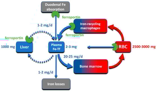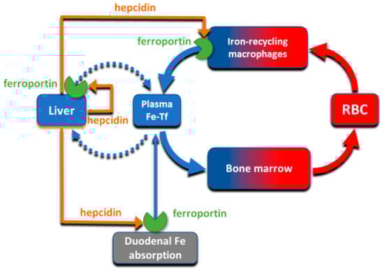 - Fillet, G.; Beguin, Y.; Baldelli, L. Model of reticuloendothelial iron metabolism in humans: Abnormal behavior in idiopathic hemochromatosis and in inflammation. Blood 1989, 74, 844–851. [Google Scholar] [CrossRef]