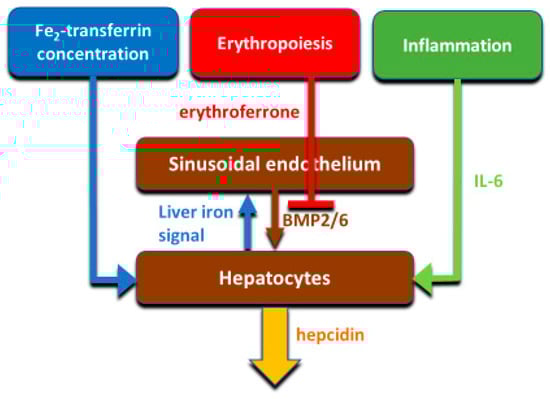 - Wang, C.Y.; Babitt, J.L. Liver iron sensing and body iron homeostasis. Blood 2019, 133, 18–29. [Google Scholar] [CrossRef] [PubMed]