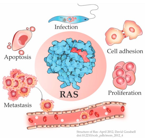 Ras is a signaling switch that regulates counteracting cellular functions like cell proliferation and apoptosis. Emerging studies have elucidated new functions of Ras e.g., in cytoskeletal rearrangement regulating cell adhesion and in parasitic infections like Leishmania, in addition to its well-known role in cancer progression. (Structure of Ras-April 2012, David Goodsell [5]).