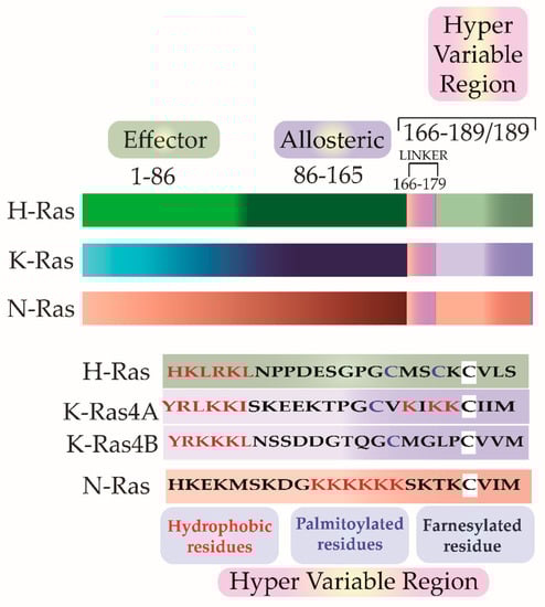 Scolnick et al. first hypothesized and Stehelin et al. later experimentally proved that these oncogenes were the proto-oncogenes which, when mutated and virally transferred, were converted to transforming oncogenes [6,7]. As observed by Harvey and Kirsten, the retroviruses arose as a result of the passage of the murine leukemia virus through rats. The process of genetic recombination accounts for the presence of such cellular genetic elements in simple retroviruses. A plausible hypothesis, as framed by various researchers, holds that integration of a provirus may occur upstream of a cellular sequence forming a chimera of cellular-viral genetic elements. In subsequent replications, non-homologous recombination occurs between the cellular and viral genetic elements leading to the acquisition and incorporation of cellular genetic elements into the retroviruses [8,9,10]. Later in the 1980s, Scolnick and his colleagues found the cellular origin of this membrane-associated protein, which is dependent on guanosine-5′-triphosphate (GTP) binding for its activation [11,12,13]. It was discovered that three loci of this gene encode for four proteins with ~80% sequence similarity: Harvey Ras (H-Ras), K-Ras A and B (Kirsten-Ras), and neuroblastoma Ras (N-Ras). K-Ras gene encodes for two proteins K-Ras4A and K-Ras4B via alternative splicing. These splice variants have distinct membrane targeting sequences. Except for a few residues, these isoforms have identical amino acid (aa) sequences in their G-domain (aa 1–86), and variations lie in the allosteric lobe (aa 87–166) and the hypervariable region (HVR) (aa 166–178/179) [14]. The HVR can be further subdivided into a linker domain (aa 166–178/179) and a targeting domain, wherein the post-translationally modified residues lie (aa 179/180–189) [15]. As the fourth exon in K-Ras encodes for the HVR, there lie differences in the HVR of K-Ras4A and K-Ras4B. K-Ras4A undergoes palmitoylation, whereas, K-Ras4B, which lacks a palmitoylation site, adds polylysine residues (Figure 2).