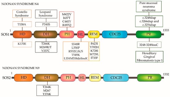The various mutant residues of SOS1 In Noonan syndrome 4 (NS4), hereditary gingival fibromatosis type 1 (HGF-1), pure mucosal neuroma syndrome, Costello syndrome (CS), and Leopard syndrome (LPRD). SOS2 shares ~70% sequence similarity with SOS1 and mutation in its DH domain leads to Noonan syndrome 9 (NS9).