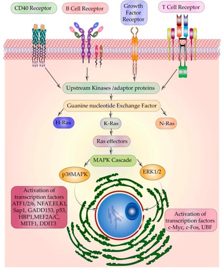 Ras is activated not only by receptor tyrosine kinases but also by receptors enriched on immune cells like B cell receptor, T cell receptor, CD40 receptor, and certain Toll-like receptors. On receptor ligation, the signal relay occurs through upstream kinases or adaptor proteins that activate guanine nucleotide exchange factors (GEFs). Ras isoforms have activator specificities that are context-dependent. Once activated H, K and N-Ras activate specific effectors that contain-Ras-binding domain (RBD). The signal is further relayed downstream via MAPK cascades which leads to activation of transcription factors and hence cellular responses.