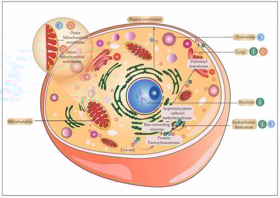 Contente et al. reported the presence of H-Ras in both cytoplasmic and nuclear extracts, and treatment with FTI caused the loss of H-Ras from the nucleus. This presence of H-Ras in the nucleus synchronized with different phases of the cell cycle in both transformed as well as Ras-transformed and non-transformed cells. The peak of the H-Ras signal corresponded to the S-phase of the cell cycle implying a role of this isoform in replication [153]. Figure 6 shows the various subcellular locations of H, K, and N-Ras.