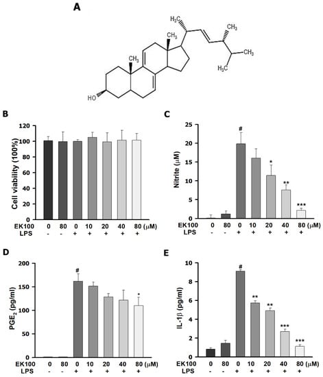 Effects of EK100 on the cell viability and cytokines release in LPS-stimulated RAW264.7 murine macrophage cells. (A) The chemical structure of EK100; RAW264.7 cells were pretreated with EK100 (0, 10, 20, 40, and 80 µM) for 1 h, then incubated with LPS (100 ng/mL) for 24 h. The suspension media was separated from the remaining cells. (B) In the remaining cells, we analyzed the cytotoxicity with the MTT reagent (n = 3). (C) In the suspension media, the NO production was detected with the Griess reagents (n = 3). The production of PGE2 (D) and IL-1β (E) was measured by using the specific ELISA kit, respectively (n = 3). Data are presented as the means ± standard error of the means (SEM). # p < 0.05 compared to the control group, * p < 0.05, ** p < 0.01, and *** p < 0.001 compared to the LPS alone group.
