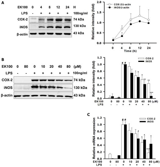 EK100 suppressed LPS-induced mRNA and protein expression of pro-inflammatory mediators of iNOS and COX-2 in RAW264.7 cells. (A) Cells were treated with 80 μM of EK100 and then treated with 100 ng/mL LPS at 0, 4, 8, 12, and 24 h to evaluate the protein expression maximum peak of iNOS and COX-2 in LPS-stimulated RAW264.7 cells. (B) Cells were treated with 0, 10, 20, 40, and 80 μM of EK100 for 1 h and incubated with 100 ng/mL of LPS for 30 min. The protein expression of iNOS and COX-2 were detected by western blotting (n = 3). (C) The expression of mRNA of iNOS and COX-2 were detected by Q-PCR (n = 3), as designated in the Section 4. Data are presented as the means ± SEM. # p < 0.05 compared with the control group, * p < 0.05, ** p < 0.01, and *** p < 0.001 compared with the LPS alone group.