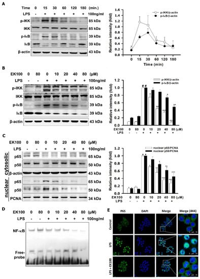 Effects of EK100 on the phosphorylation of IKK/IκB and the translocation of NF-κB in LPS-induced RAW264.7 cells. (A) Cells were treated with 80 μM EK100 and then treated with 100 ng/mL LPS at 15, 30, 60, 120, and 180 min to evaluate the protein maximum peak of p-IKK and p-IκB in LPS-stimulated RAW264.7 cells. (B) Cells were pretreated with 0, 10, 20, 40, and 80 μM of EK100 for 1 h and stimulated with 100 ng/mL of LPS for 30 min. The protein expression of p-IKK, IKK, p-IκB, and IκB was detected by western blotting (n = 3). (C) The protein expressions of transcription factor p65 and p50 from the cytoplasm to the nucleus were measured by western blotting (n = 3). (D) With the EMSA assay, we detected that NF-κB bonded to DNA developed the DNA–NF-κB complex. (E) The localization of p65 in the cytoplasm and nucleus were measured by immunofluorescence staining, as designated in the Section 4 (n = 3). Data are presented as means ± SEM. # p < 0.05 compared with the control group, * p < 0.05, ** p < 0.01, and *** p < 0.001 compared with the LPS group.