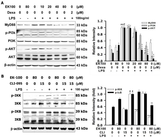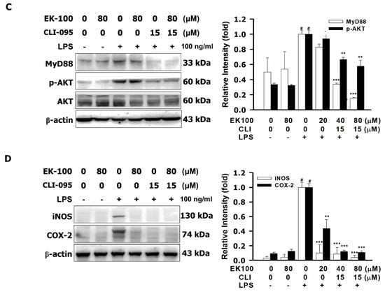 Effects of EK100 on the PI3K/Akt signaling pathway in LPS-induced RAW264.7 cells. (A) Cells were pretreated with EK100 (0, 10, 20, 40, and 80 μM) and Dexa (2 μM) and then stimulated with 100 ng/mL of LPS. The phosphorylation of PI3K and Akt were analyzed (n = 3). (B) The EK100 (80 μM) inhibitor, CLI-095, (15 μM) influenced the LPS-stimulated phosphorylation of IKK and IKB protein expression (n = 3). (C) EK100 (80 μM) plus TLR4 inhibitor, CLI-095, (15 μM) influenced the LPS-stimulated phosphorylation of p-Akt and MyD88 protein expression (n = 3). (D) EK100 (80 μM) plus TLR4 inhibitor, CLI-095, (15 μM) influenced LPS-stimulated iNOS and COX-2 protein expression in RAW264.7 cells, and they were analyzed (n = 3) as designated in the Section 4. Data are presented as means ± S.E.M. # p < 0.05 compared with the control group, * p < 0.05, ** p < 0.01, and *** p < 0.001 compared with the LPS only group.