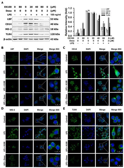 Effects of EK100 on the protein expression of LBP, CD14, and TLR4/MD-2 co-receptors in LPS-stimulated RAW264.7 cells. Cells were pretreated with EK100 (0, 10, 20, 40, and 80 μM) and stimulated with LPS (100 ng/mL) for 24 h. (A) The protein expressions of LBP, CD14, MD-2, and TLR4 were measured by western blotting, as designated in the Section 4 (n = 3). Representative images were measured with IF staining of (B) LBP, (C) CD14, (D) MD-2, and (E) TLR4. All data were presented as the mean ± SEM (n = 3). # p < 0.05 compared with the control group, * p < 0.05 and *** p < 0.001 as compared with the LPS alone group.