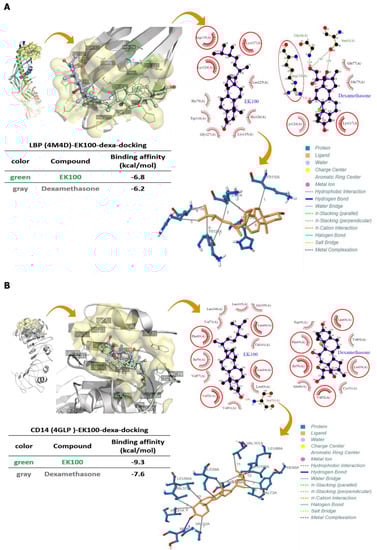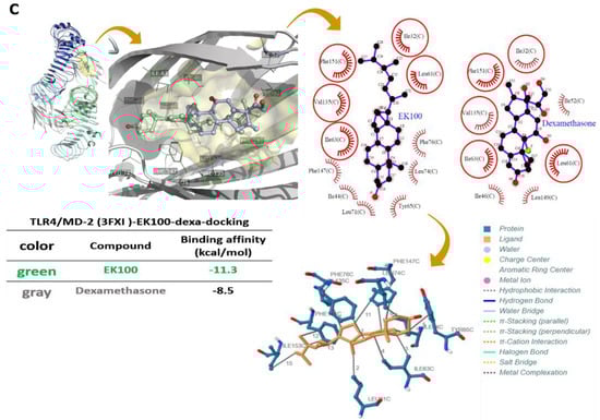 We simulated EK100, and Dexa interfered with LPS binding to LBP, CD14, the TLR4/MD-2 complex co-receptor within the LigPlot+ 2D diagrams protein–ligand docking model. EK100 had hydrophobic interactions with LBP, including residues His79, Lys115, Trp116, Leu125, His126, and Gly127 tight binding with LBP. Simulation results indicated that the best binding affinity of EK100 was −6.8 kcal/mol, and of Dexa, it was −6.2 kcal/mol, respectively (Figure 6A). EK100 had hydrophobic interactions in the residues of Val57, Val73, Leu89, Val91, Val101, Leu105, Leu106, and Ala10,9 and it has a hydrogen bond in Ser53 to bind to CD14. Theoretical analysis and computer simulation results showed that the best binding affinities of EK100 were −9.3 kcal/mol, and of Dexa, it was −7.6 kcal/mol, respectively (Figure 6B). EK100 also had a hydrophobic interaction with residues Ile44, Tyr65, Leu71, Leu74, Phe76, and Phe147. The results demonstrated that EK100 and Dexa could significantly improve the binding affinities in the hydrophobic pocket of MD-2, regarding PyRx docking, which were found to be −11.3 and −8.5 kcal/mol, respectively (Figure 6C). In conclusion, the simulation results indicated that EK100 and Dexa could interfere with the receptor binding of LBP, CD14, and MD-2 on the TLR4 co-receptors in LPS-stimulated RAW264.7 cells.