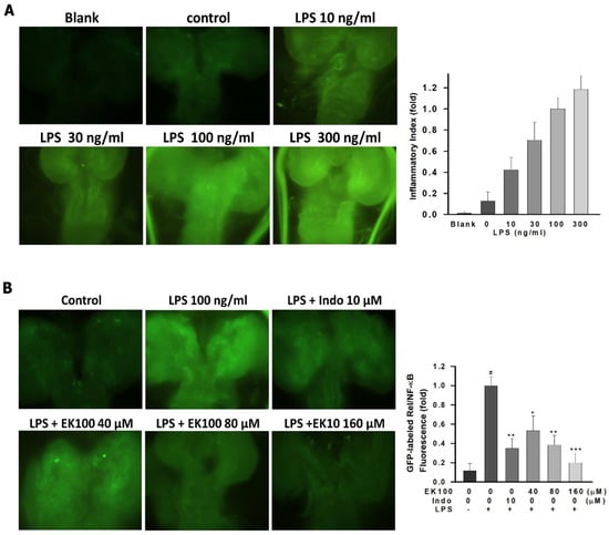 Effects of EK100 on the GFP-labeled Rel/NF-κB fluorescence reporter gene expression in Drosophila. (A) The GFP-labeled Rel/NF-κB reporter gene showed GFP expression in the brains of larvae Drosophila. The leak of the GFP-labeled Rel/NF-κB of larvae in a wild-type genetic background is shown as a blank group. It was pretreated with LPS (10, 30, 100, and 300 ng/mL) for 98 h. The GFP-labeled Rel/NF-κB fluorescence expression was detected using a microscope with a GFP fluorescence channel (Nikon BX51 (Nikon, Tokyo, Japan) with a charge-coupled device (CCD) camera (SPOT; Diagnostic Instruments; Sterling Heights, MI). (B) EK100 (0, 40, 80, and 160 μM) or indomethacin (10 μM) were added to Drosophila in a culture medium and incubated with LPS (100 ng/mL) for 96 h. Relative GFP-labeled Rel/NF-κB fluorescence reporter gene expression in whole larvae and the values obtained with dissected tissues were expressed as folds of this value. The histograms correspond to the mean value ± SEM of the three independent experiments. # p < 0.05 compared with the control group, * p < 0.05, ** p < 0.01 and *** p < 0.001 as compared with the LPS alone group.