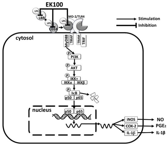 The proposed mechanism represents the anti-inhibiting inflammatory effect of EK100 in LPS-stimulated RAW264.7 cells. Results suggested that EK100 interferes with LPS binding to LBP, CD14, and the TLR4/MD-2 co-receptor, and its activation inhibits TLR4/MyD88-dependent signaling, the phosphorylation of PI3K/AKT/IKK pathways, and the activation of NF-κB signal pathway in LPS-stimulated macrophage-like RAW264.7 cells.