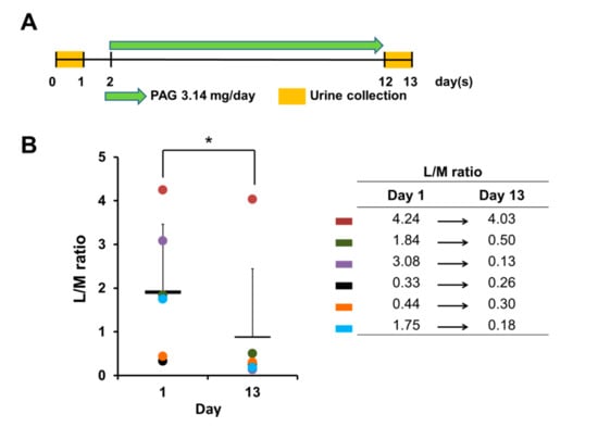 PAG improves leaky gut condition in vivo. (A) Experiment schedule: two-year-old C57BL/6 mice were treated with 143 mg/kg PAG daily for 10 days; 24-h urine samples were collected to determine lactulose and mannitol concentrations before and after PAG administration; (B) L/M ratio of mice before and after PAG treatment, presented as mean ± standard deviation (Student t-test was applied for statistical analysis, * p < 0.05); different colors represent different mice within the group.