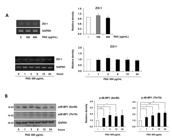 PAG increases expression level of ZO-1 at translation level. (A) Dose-dependent and time-dependent alterations of ZO-1 at the mRNA level in Caco-2 monolayers treated with 400 μg/mL PAG; (B) PAG 400 μg/mL exposure time-dependently induces phosphorylation of the translation repressor 4E-BP1 and ERK1/2 in Caco-2 monolayers. Values are presented as mean ± standard deviation (Student t-test was applied for statistical analysis, * p < 0.05, ** p < 0.01, *** p < 0.001).