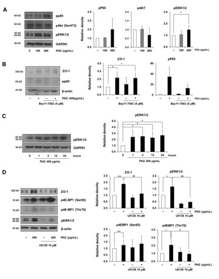 PAG increases expression level of ZO-1 via activating MAPK/ERK signaling pathway. (A) Caco-2 monolayers were treated with PAG to investigate different tight junction-related signaling pathways; (B) NF-κB inhibitor BAY11-7082 was employed to investigate the association between NF-κB/P65 and ZO-1 expression levels in Caco-2 cells under 48-h PAG treatment; (C) Caco-2 treated with PAG showed increased phosphorylated MAPK/ERK, in a pattern similar to phosphorylation of 4E-BP1; (D) Caco-2 monolayers were pre-treated with or without MAPK inhibitor U0126 10 μM along with exposure to PAG for 48-h, to determine the relation between MAPK/ERK, 4E-BP1, and ZO-1 expression levels. Values are presented as mean ± standard deviation (Student t-test was applied for statistical analysis; *, # p < 0.05; ## p < 0.01; *** p < 0.001).