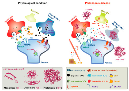 Neuronal transmission at corticostriatal synapses is altered in PD [151], due to the impaired afflux of DA in striatum that leads to LTP and LTD loss [151]. In this scenario, synaptopathy seems to strictly be linked to α-syn aggregated species [83]. Moreover, the immune system seems to be involved in the α-syn-induced PD synaptopathy. Resident immune cells in the brain may regulate synaptic transmission. As seen above, microglia and astrocytes monitor the surrounding environment, but when activated, for example by α-syn aggregation, they produce cytokines, chemokines, neurotransmitters, and growth factors, through which they can modulate neuronal plasticity. Indeed, many studies have demonstrated an increase of cytokine levels in the striatum and CSF of Parkinsonian patients. Interestingly, these molecules are involved in the synaptic plasticity process [151].