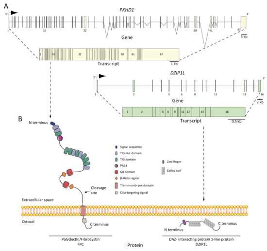 - Lu, H.; Galeano, M.C.R.; Ott, E.; Kaeslin, G.; Kausalya, P.J.; Kramer, C.; Ortiz-Brüchle, N.; Hilger, N.; Metzis, V.; Hiersche, M.; et al. Mutations in DZIP1L, which encodes a ciliary-transition-zone protein, cause autosomal recessive polycystic kidney disease. Nat. Genet. 2017, 49, 1025–1034. [Google Scholar] [CrossRef]