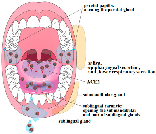As SARS-CoV-2 infection can be caused by direct inhalation of saliva droplets produced during meals, conversation, or singing, or by eating the droplets attached to food, saliva that is not contaminated by secretions from the nasal cavity or lower respiratory tract, i.e., intact saliva freshly secreted from salivary ducts, can also be a source of infection. In fact, ACE2 has been reported to be expressed in the salivary glands of patients with COVID-19, and SARS-CoV-2 has been detected in intact saliva directly collected from the opening of the submandibular gland duct, i.e., that of the sublingual peduncle [23].