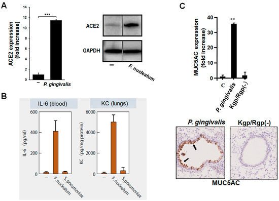 Induction of ACE2 and production of proinflammatory cytokines by oral bacterial stimulations. (A): Periodontopathic bacterium, Fusobacterium nucleatum, in contact with a human alveolar epithelial cell line induced expression of ACE2 mRNA (left panel) and protein (right panel) levels after 48 h. (B): Aspiration of F. nucleatum in mice induced higher levels of IL-6 and KC (murine IL-8) in the lungs and blood than that of aspiration with Streptococcus pneumoniae. (C): Culture supernatant of another periodontopathic bacterium, Porphyromonas gingivalis, strongly induced the expression of MUC5AC mRNA in mouse lungs (top panel). Protein expression of MUC5AC in the mouse lungs (bottom panel); aspiration of P. gingivalis supernatant induced MUC5AC (brown) in the airway epithelium; however, no such effect was observed with gingipain-deficient P. gingivalis [Kgp/Rgp (-)]. Student’s t-test. **, p < 0.01; ***, p < 0.001.