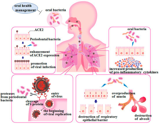 Based on the hypothesis that interactions among host-virus-bacteria may play an important role in the onset and progression of COVID-19, as they have done in influenza, the possibility of exacerbation of lower respiratory tract inflammation by aspiration of oral bacteria associated with poor oral hygiene in patients with COVID-19 will be discussed below. This is particularly relevant in the elderly and the sick who are known to be more susceptible to severe COVID-19. This is because the probability of aspiration is higher in these people due to their reduced swallowing and cough reflex function. These individuals are more likely to require more meticulous oral health management. Although the following may not be necessarily limited to SARS-CoV-2 infection/COVID-19, as it can be a common phenomenon in the lower respiratory tract inflammation associated with aspiration, we have extended our previous findings to speculate whether some aspirated oral bacteria may have enabled the establishment of SARS-CoV-2 infection or have exacerbated mild COVID-19 via the following mechanisms [37].