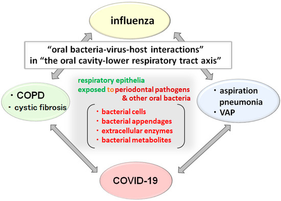 Several “oral bacteria-virus-host interactions” may be involved in giving rise to systemic diseases in “the oral cavity-lower respiratory tract axis” Pneumonia, COPD, influenza, and COVID-19, which are shown to be associated with oral bacteria, involve inflammation of the lungs as the main symptom. In addition, each disease is associated to one another. Therefore, the elucidation of the mechanism of lower respiratory tract inflammation caused by the contact of oral bacteria, extracellular appendages, such as pili and LPS, and exoenzymes with the respiratory epithelium is anticipated. Furthermore, interpreting the effect of the chronic inflammatory state of periodontal disease on systemic chronic inflammation and developing methods to control it is essential. As a result, instead of focusing on “the pathogenicity of a single microorganism” like past studies have, it is essential to examine microbial interactions, such as “oral bacteria-pneumonia-causing bacteria”, “oral bacteria-influenza virus”, and “oral bacteria-SARS-CoV-2”, especially in “the oral cavity-lower respiratory tract axis”.